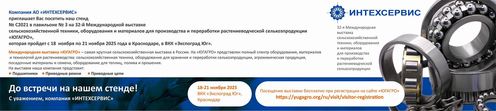 АО «Интехсервис» — надежный партнер на рынке подшипников с 2006 года. Мы развиваем собственные бренды, предлагаем продукцию от мировых производителей (SKF, KMR, TIMKEN и др.) и отечественные решения (ГПЗ, ВС, KJ). Развитая сеть складов и филиалов обеспечивает быструю доставку. Опытные инженеры оказывают техническую поддержу. 19 лет опыта позволяют нам предлагать клиентам передовые решения для бизнеса и производства.