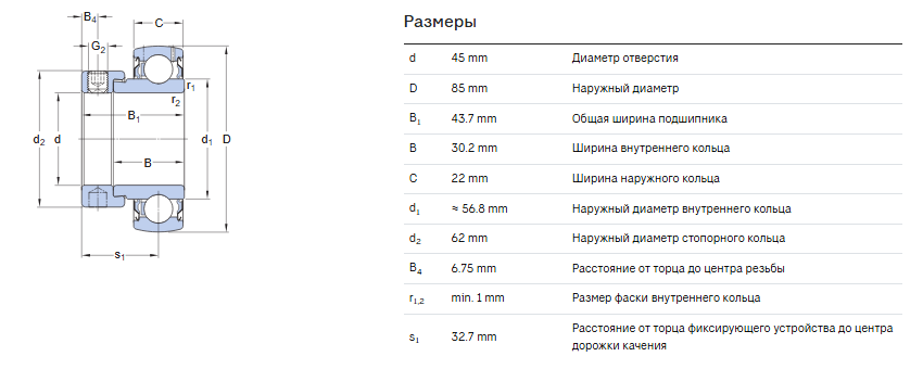 Характеристики: Подшипник имеет размеры внутреннего и наружного диаметра 45 мм и 85 мм соответственно, а также ширину 43,7 мм, вес около 649 г. Класс точности не указан, зазор радиальный, без уплотнения или сепаратора из полимерного материала.
